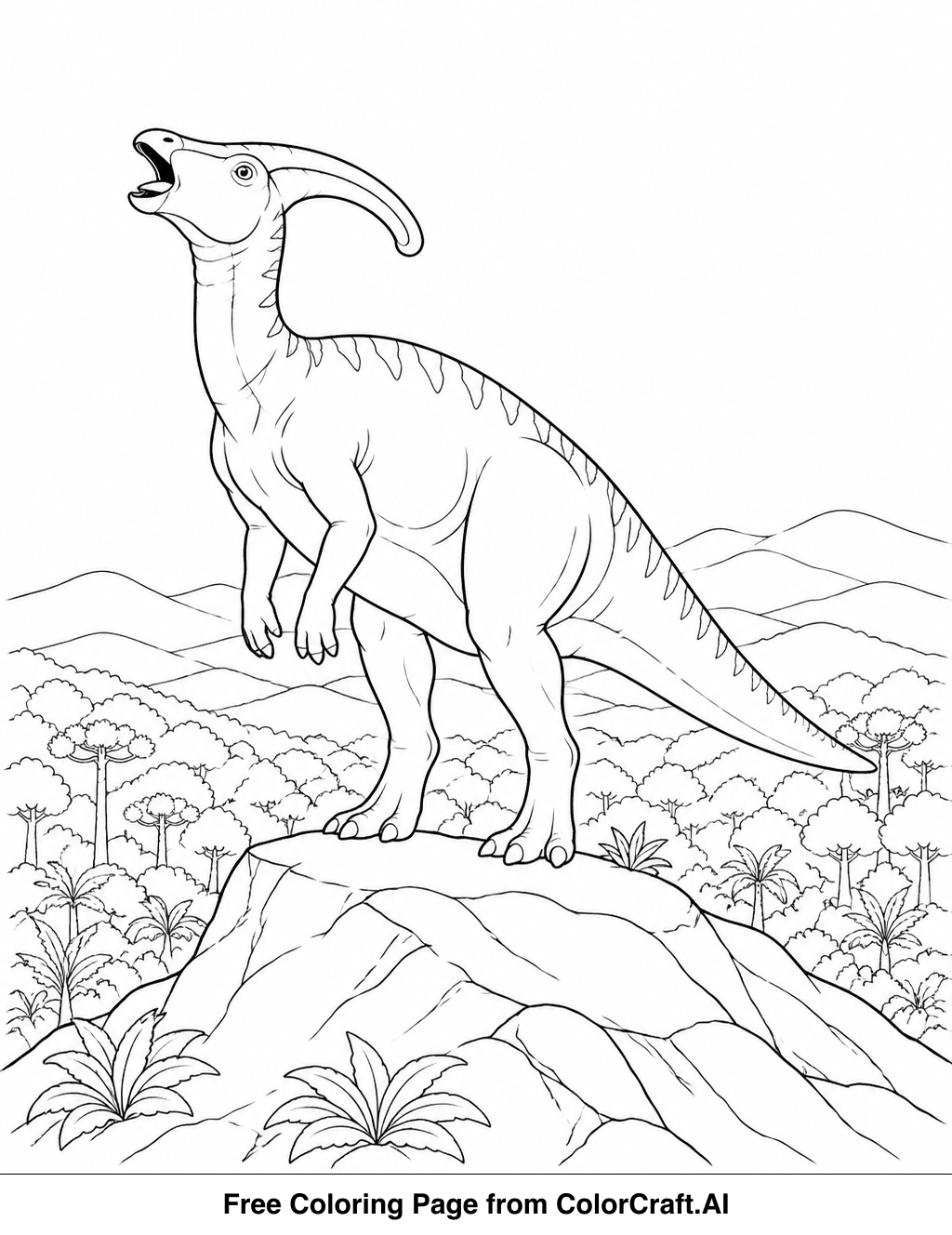 Welcome to our collection of free printable coloring pages! Get ready to print and color this amazing Parasaurolophus scene. It's a wonderful way to relax and unleash your creativity.