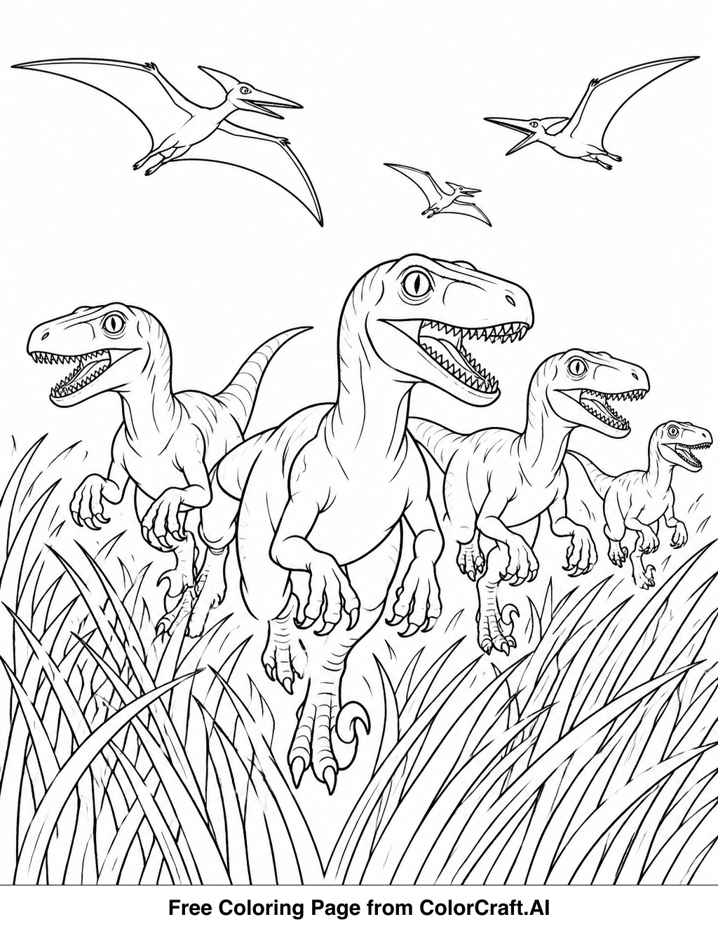 Welcome to our exciting dinosaur coloring page! Print this scene of a velociraptor pack and let your creativity run wild. It's a perfect way to relax and color.