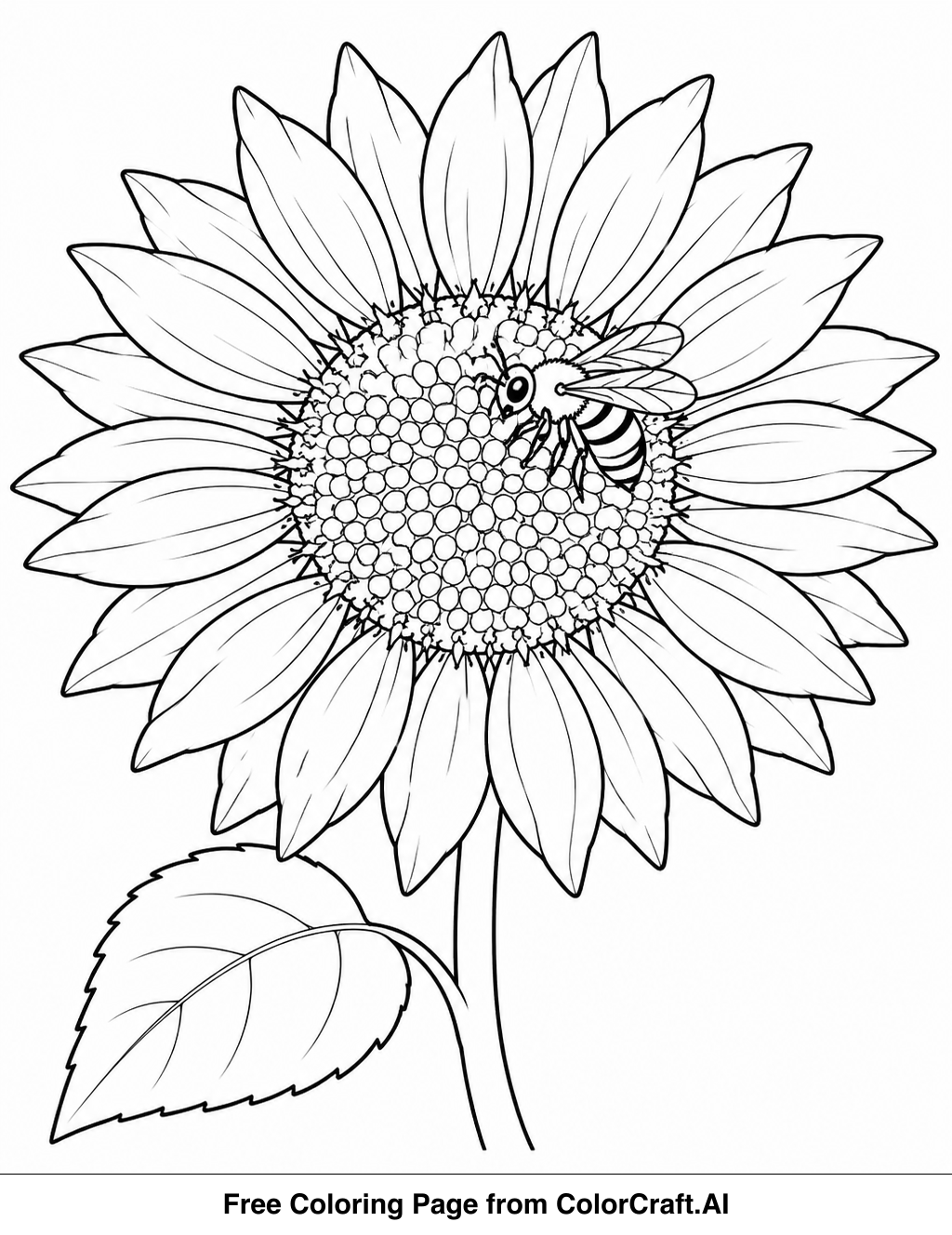 Welcome to our delightful sunflower and bee coloring page! Print this image for free and let your creativity bloom. Relax and enjoy the process of bringing this scene to life.