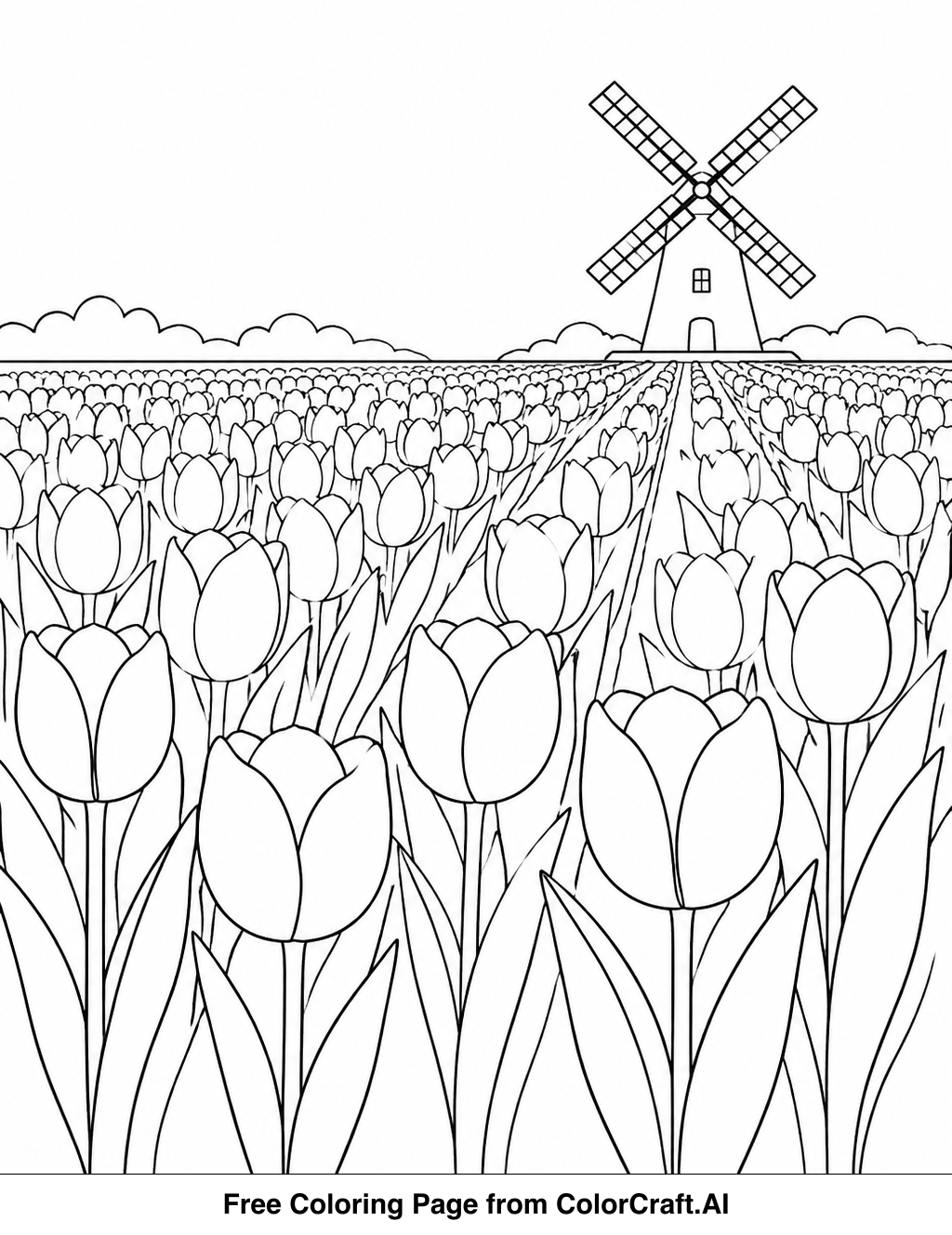 Welcome to our coloring page featuring a beautiful tulip field! Print this design for free and let your creativity flow. It's a wonderful way to relax and unwind.