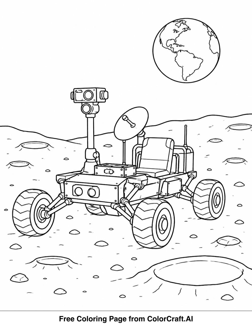 Welcome to our space-themed coloring adventure! Print this lunar rover page for free and let your creativity soar as you color the moonscape. Relax and enjoy this cosmic journey.