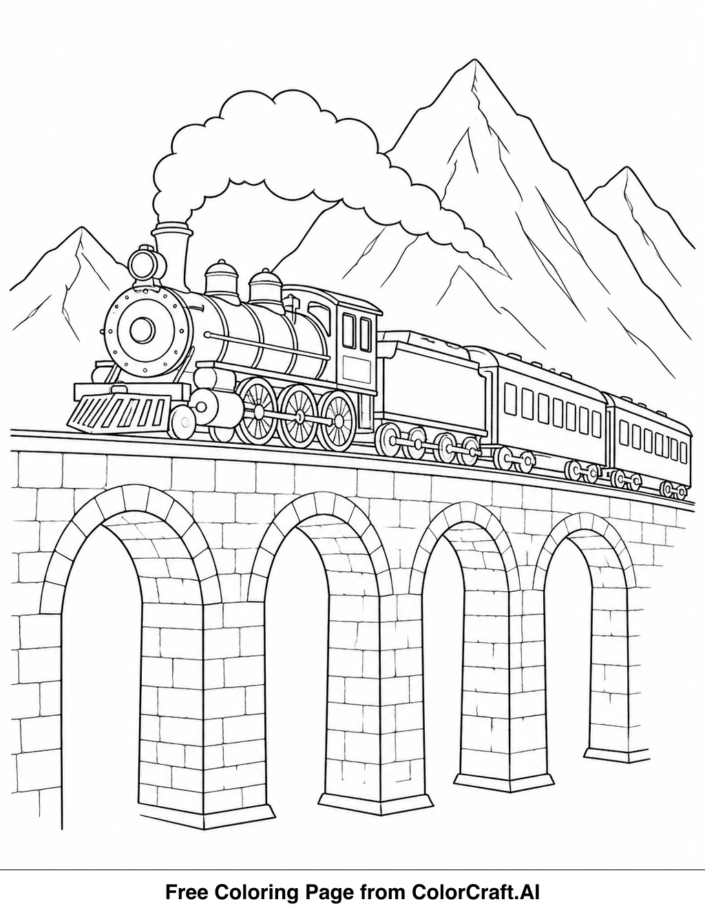 Welcome to ColorCraft! Get ready to print and color this exciting steam locomotive scene. Relax and let your creativity flow as you bring this majestic train and viaduct to life.